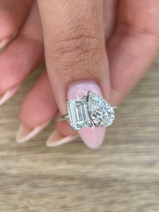 Unique 4 carat Pear + Emerald Cut IGI Certified F/VS1 Two Stone Lab Grown Diamond Solitaire Toi et Moi Ring You & Me Ring Engagement Ring
