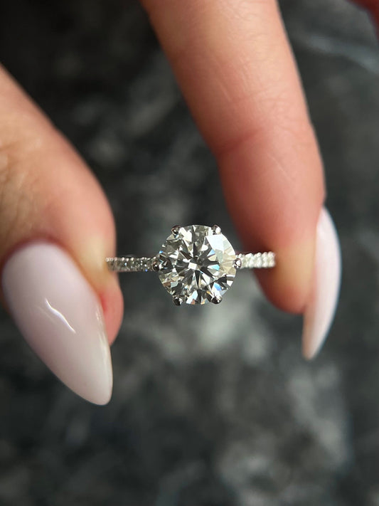 Round Ideal Cut 2 Carat IGI Certified Lab Grown Diamond F Color VS1 Clarity 4 Prong Solitaire Cathedral Style Engagement Ring