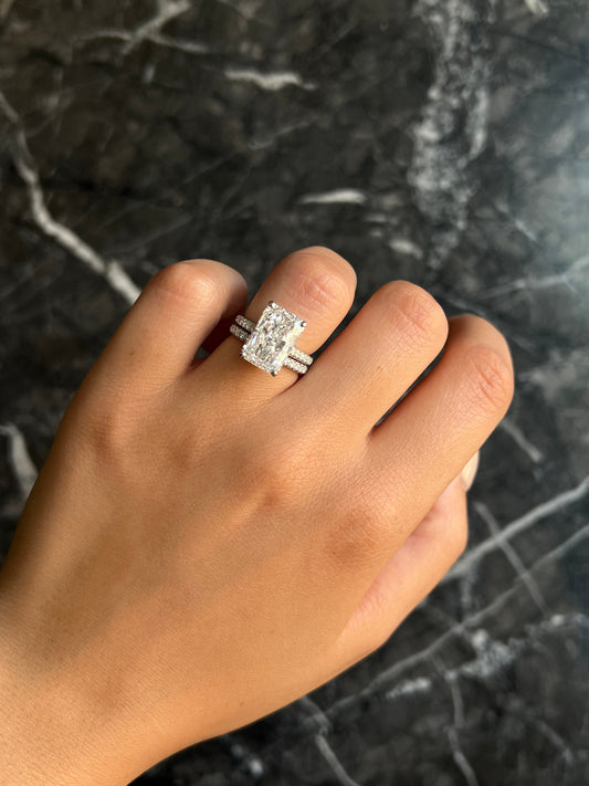Radiant Cut 6.5 Carat IGI Certified F Color VS1 Clarity Lab Grown Diamond Engagement Ring Set Hidden Halo and Matching Diamond Wedding Band
