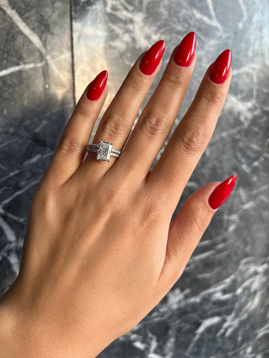 Wedding Set Radiant Cut 2.5 Carat IGI Certified F Color VVS2 Clarity Lab Diamond Hidden Halo Engagement Ring & Matching Band, Side Rounds