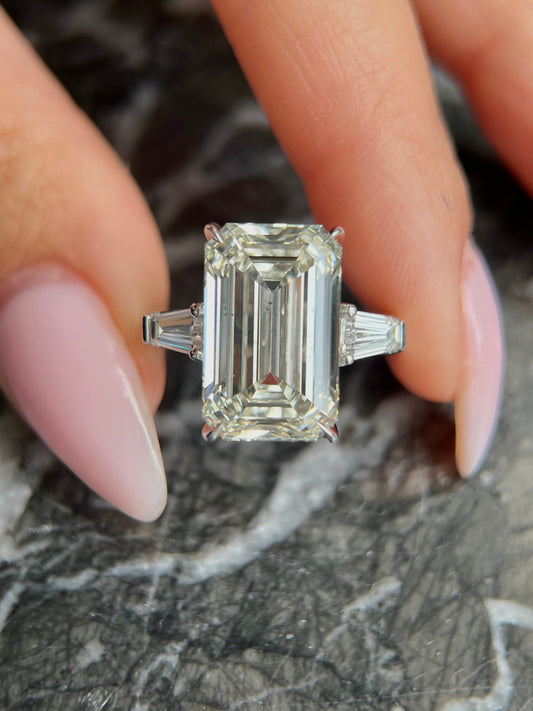 Emerald Cut 7.75 carat IGI Certified E Color VVS2 Lab Diamond Three Stone Engagement Ring, Side Trapezoids & Rounds, Handcrafted of Gold