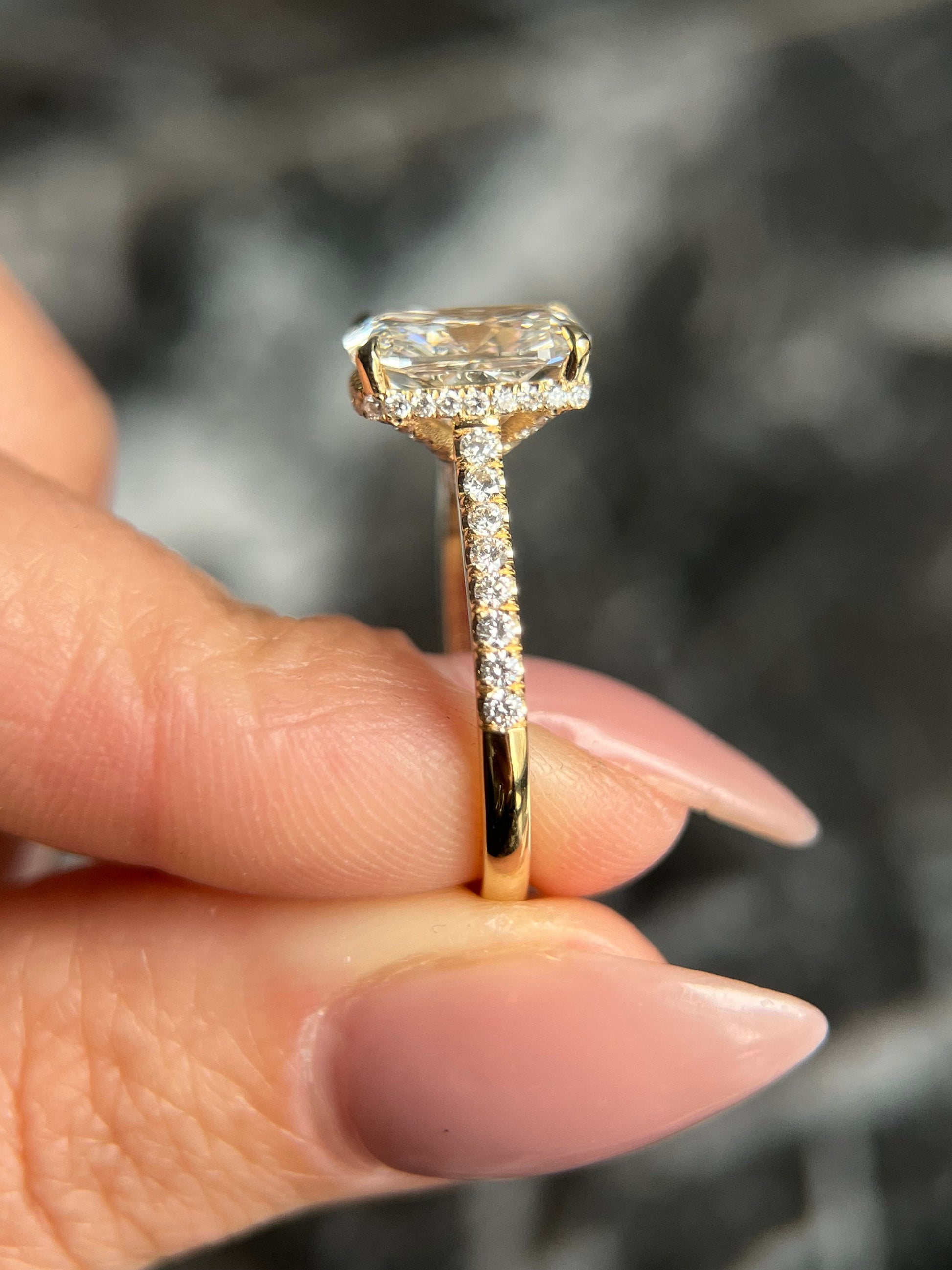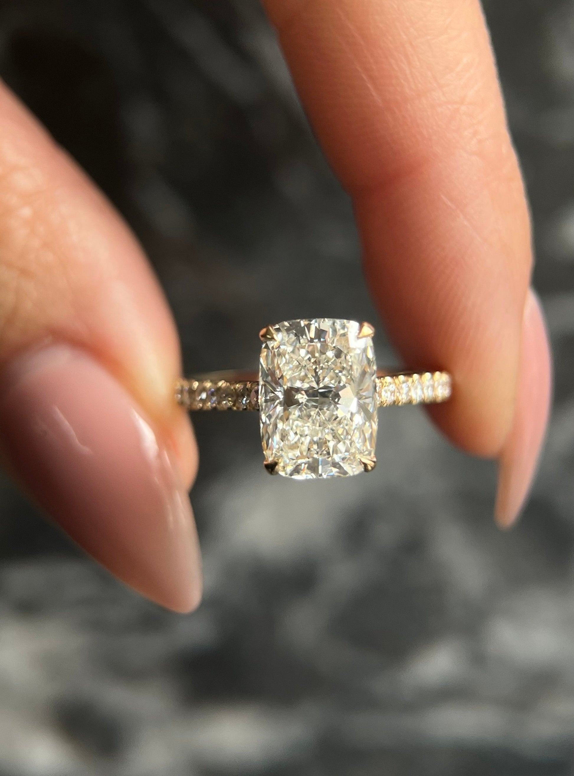 Custom Designed Elongated Cushion Cut 4.35 Carat IGI Certified F Color VS1 Clarity Lab Grown Diamond Hidden Halo Engagement Ring