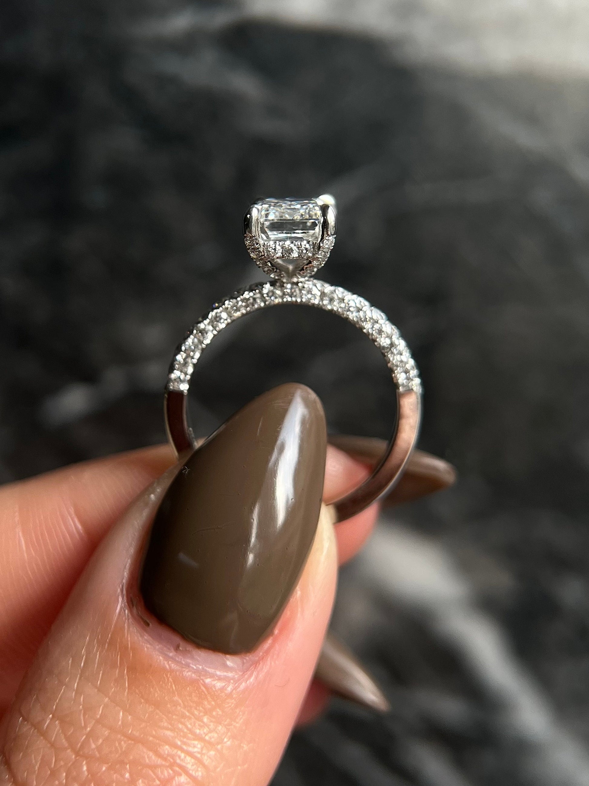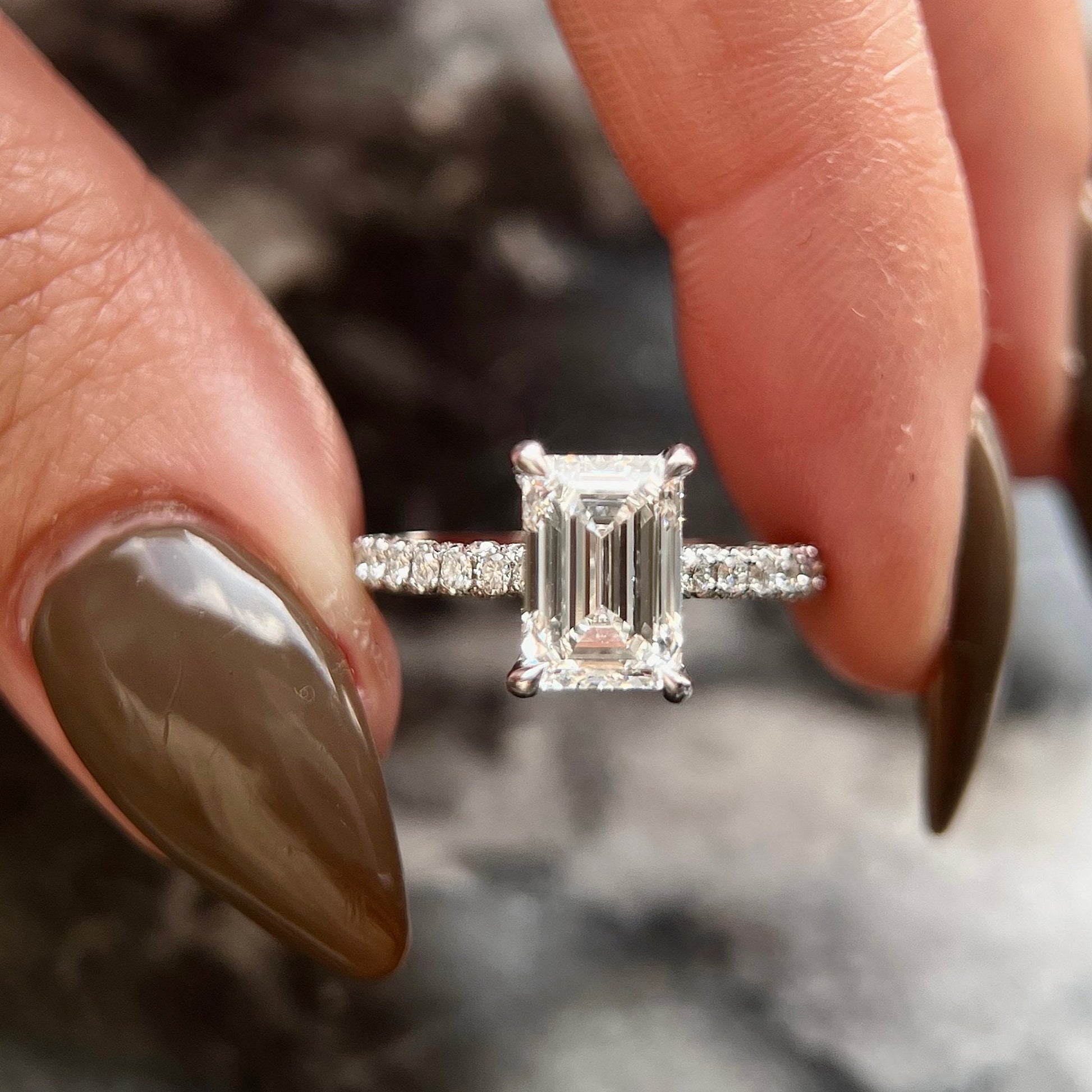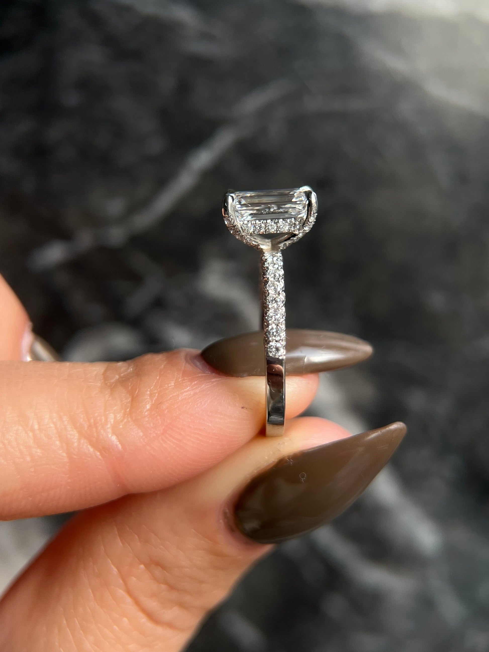 Emerald Cut 2.1 carat F Color VVS2 Clarity IGI Certified Lab Grown Diamond Hidden Halo Engagement Ring, 3 Rows Side Diamonds
