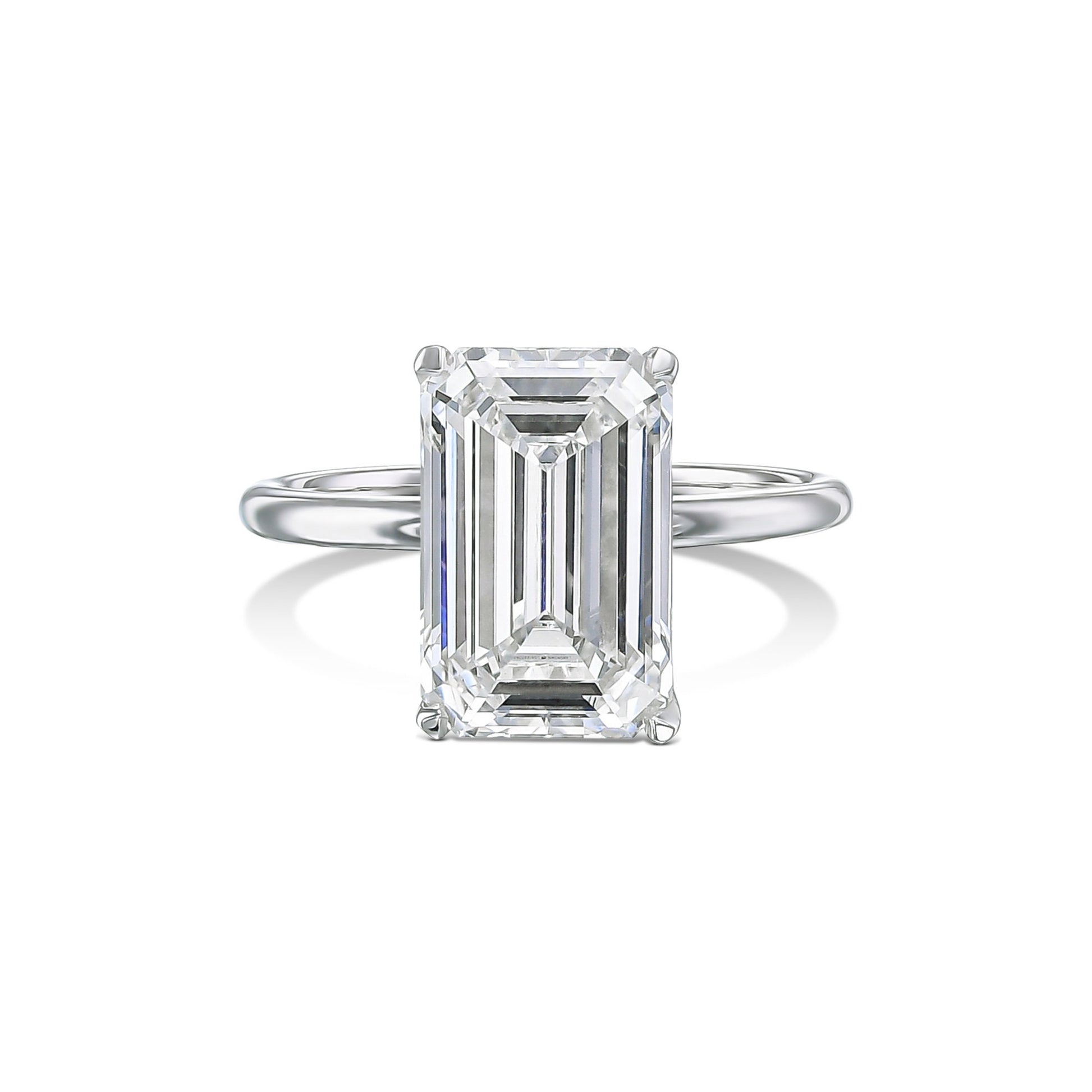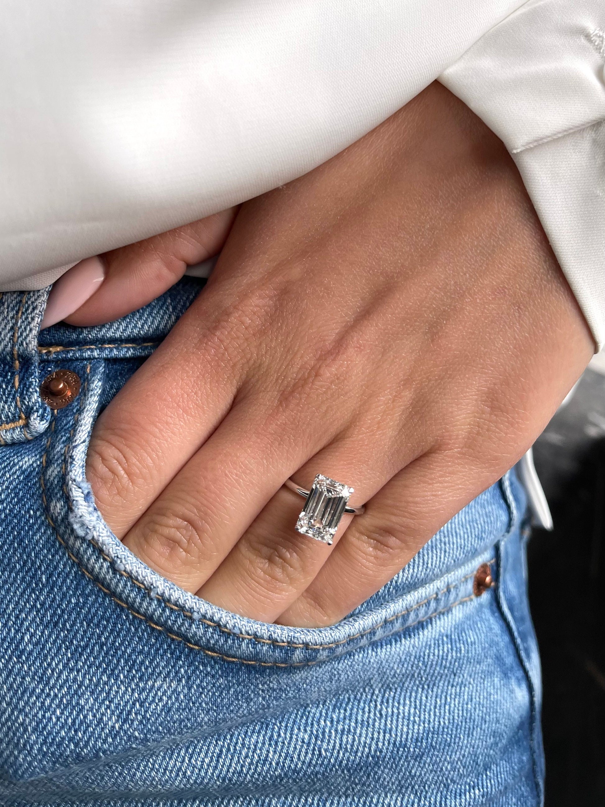 The perfect engagement ring, this handmade solitaire lab grown diamond ring features a breathtaking 4 carat IGI Certified laser inscribed Emerald Cut Lab Grown Diamond with impeccable E color and VVS2 clarity!