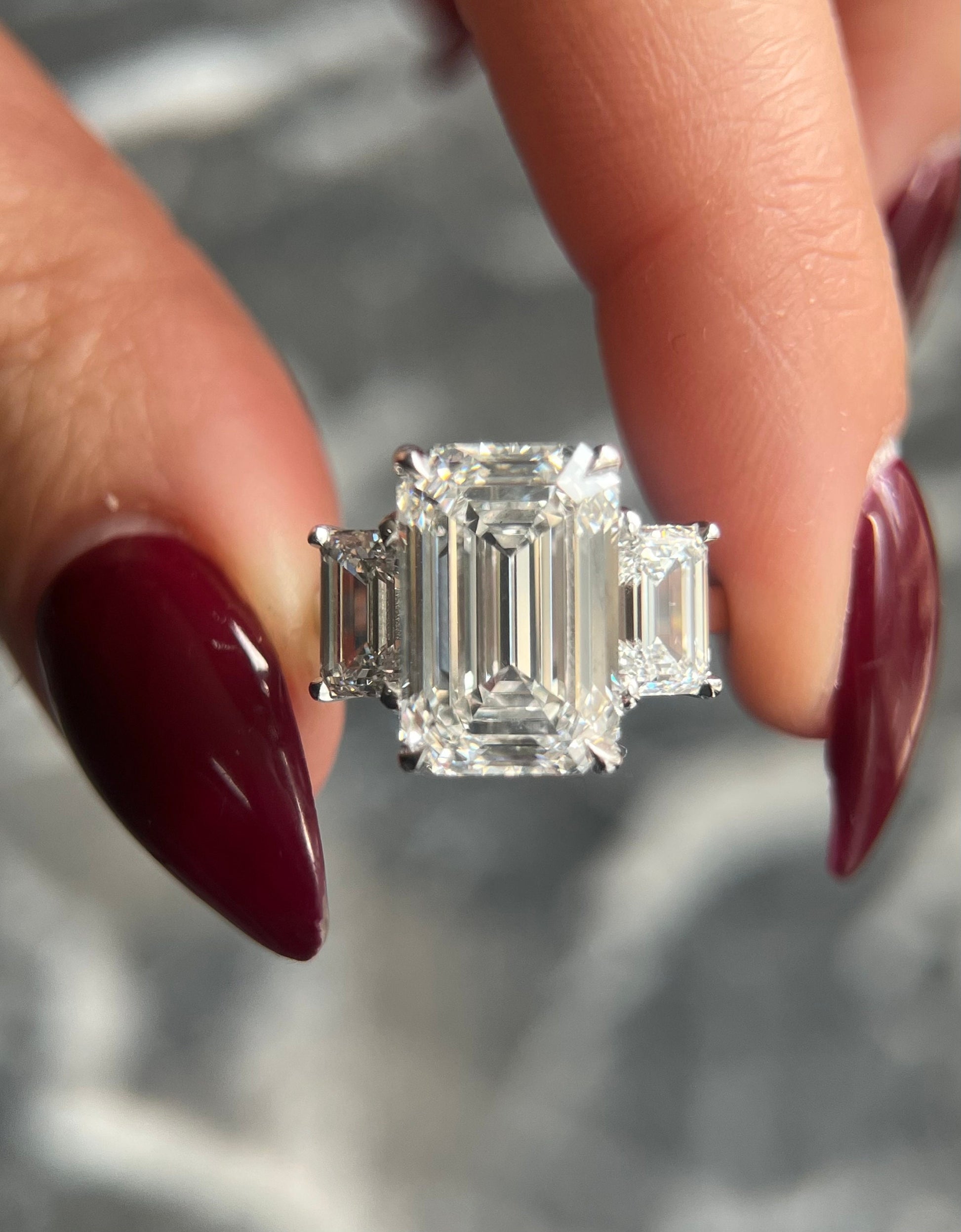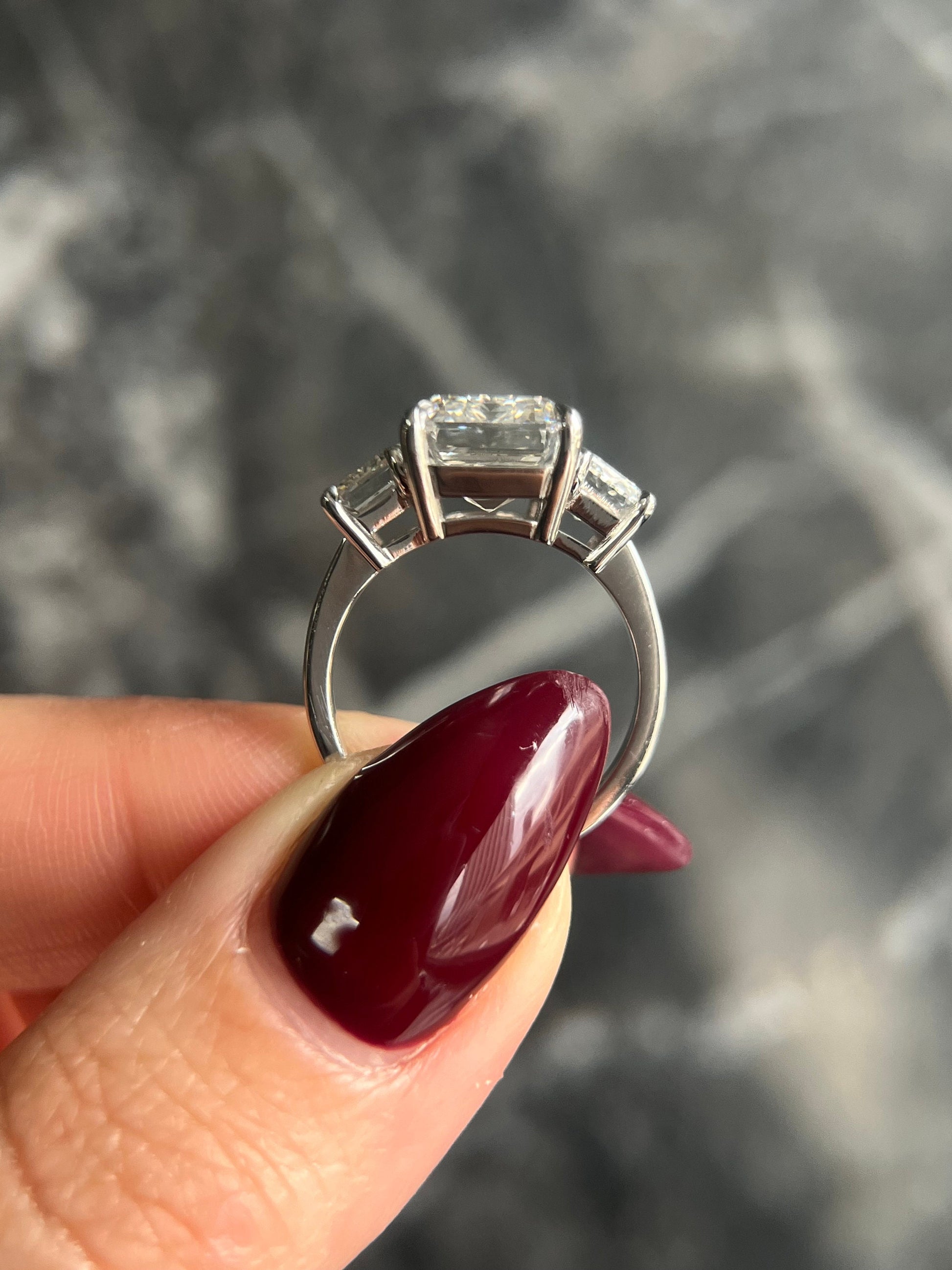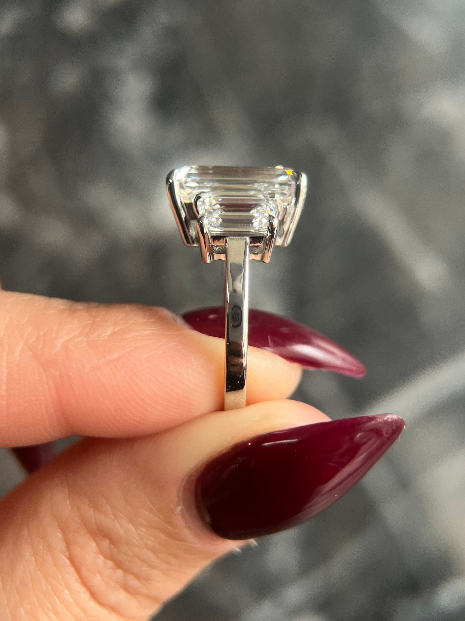 Emerald Cut 7.5 carat E Color VVS2 IGI Certified Lab Grown Diamond Three Stone Engagement Ring Gold Classic Traditional Style