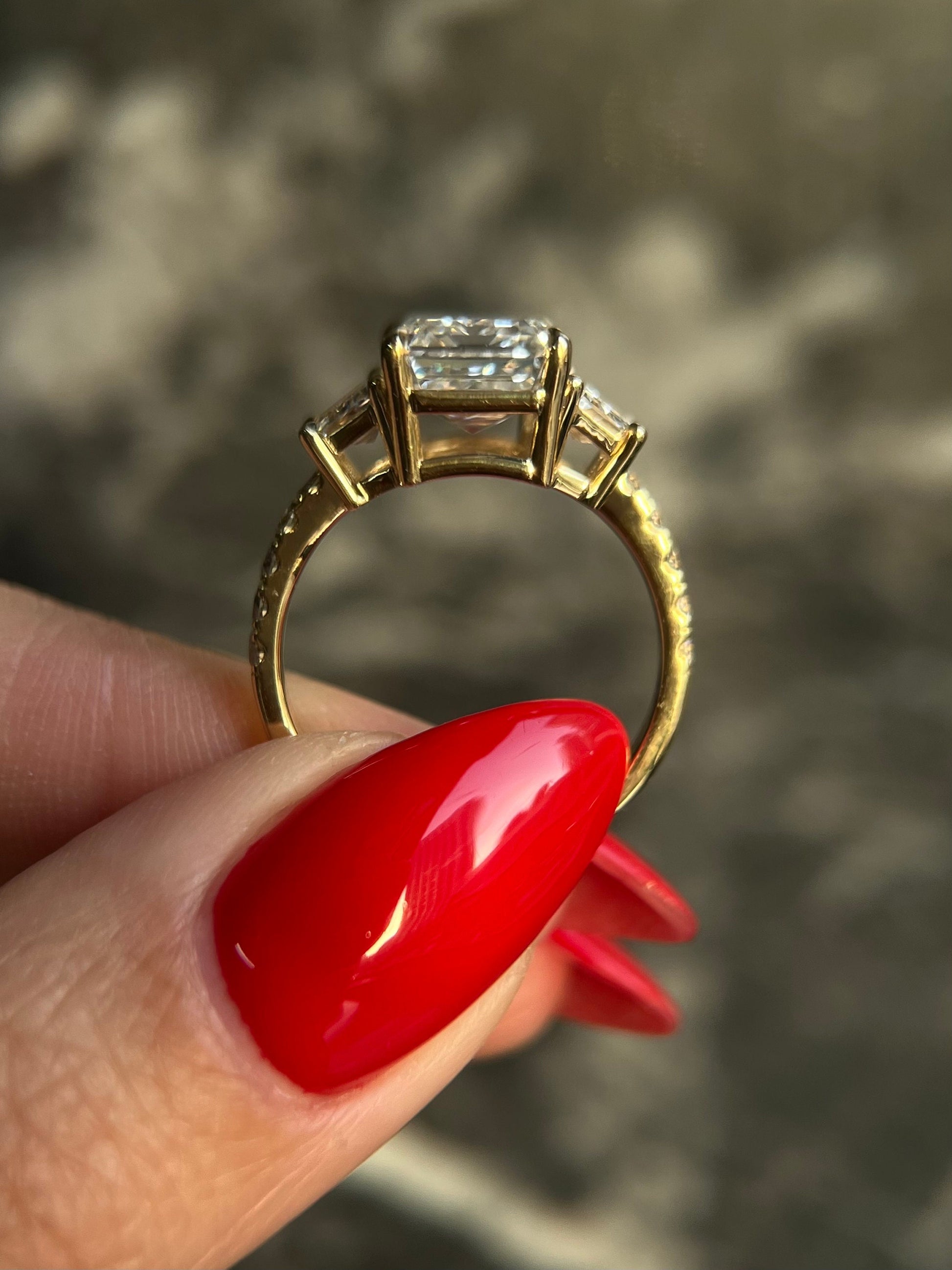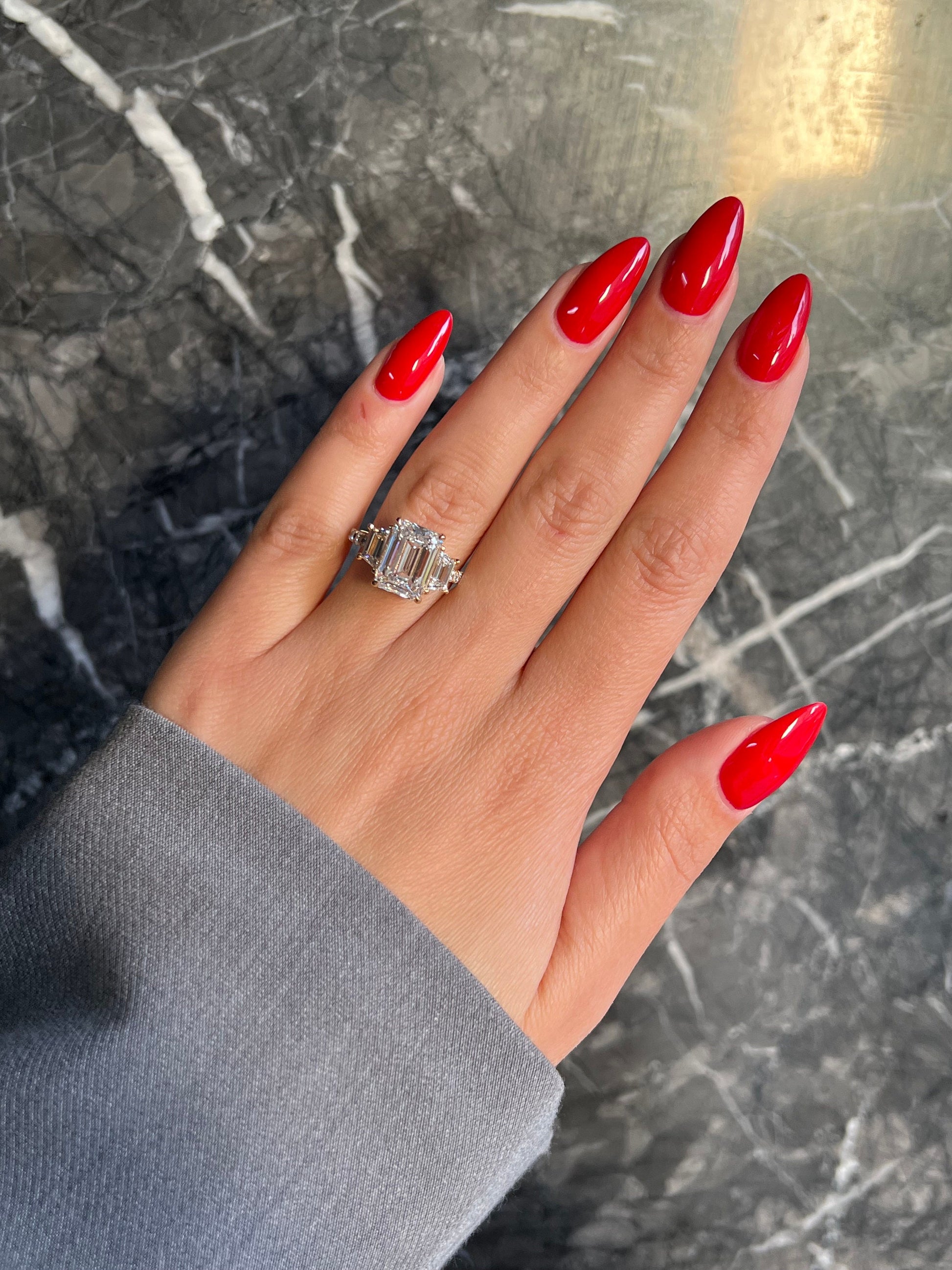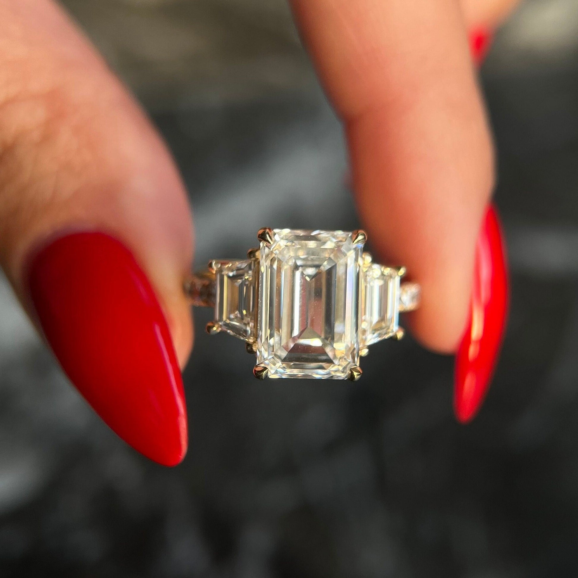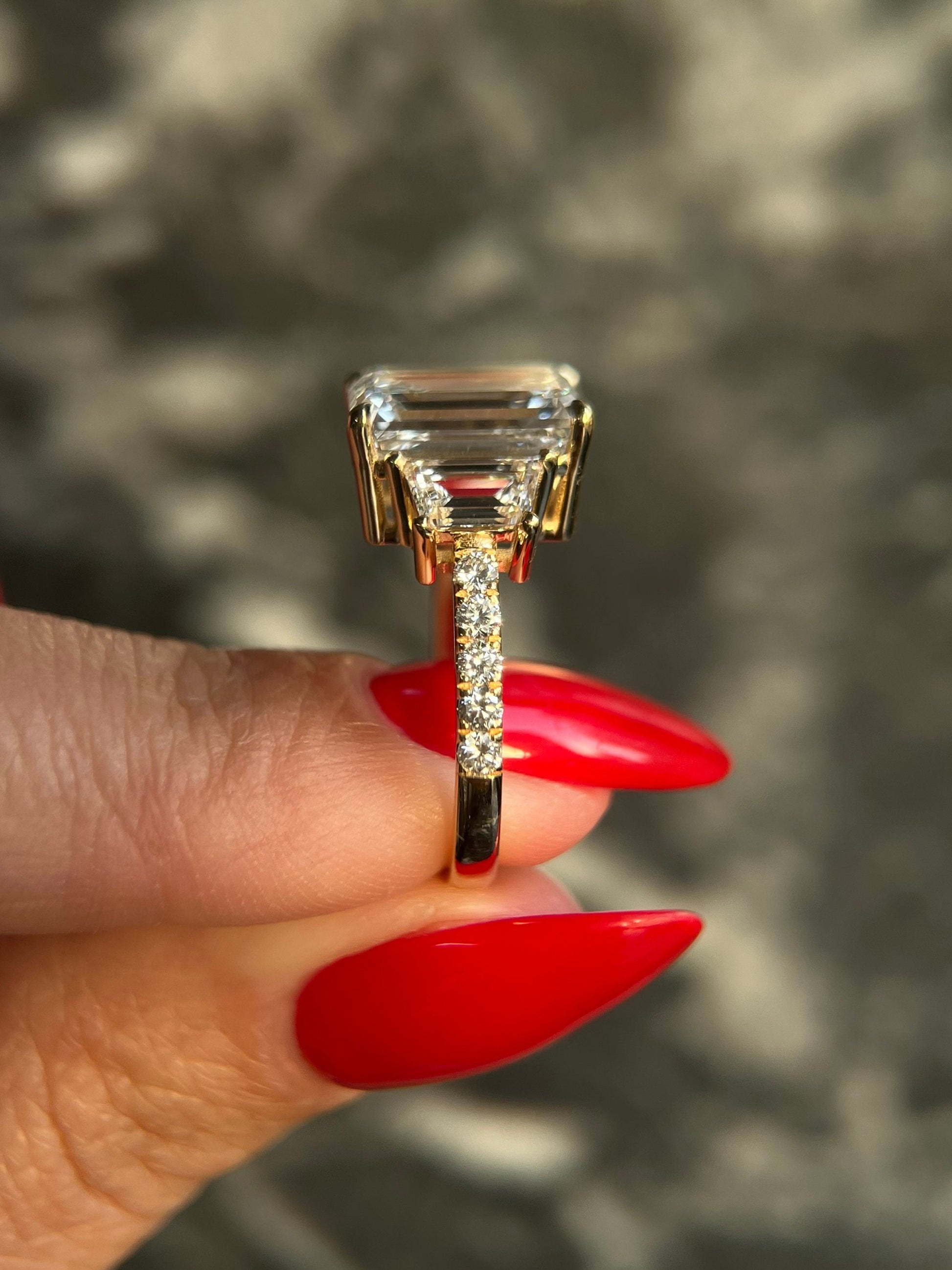 Gorgeous 7.75 carat IGI Certified Emerald Cut Lab grown diamond engagement ring featuring a 6 carat center stone diamond with 1.75 carat trapezoid and round diamonds!
