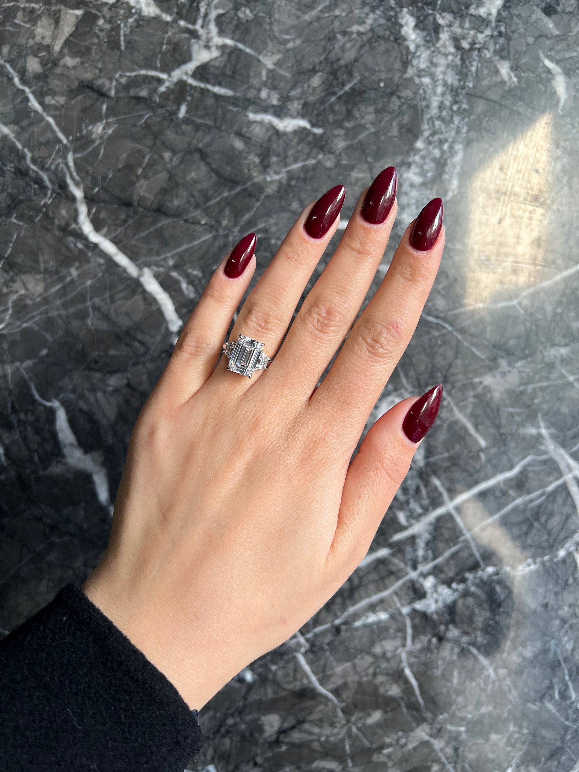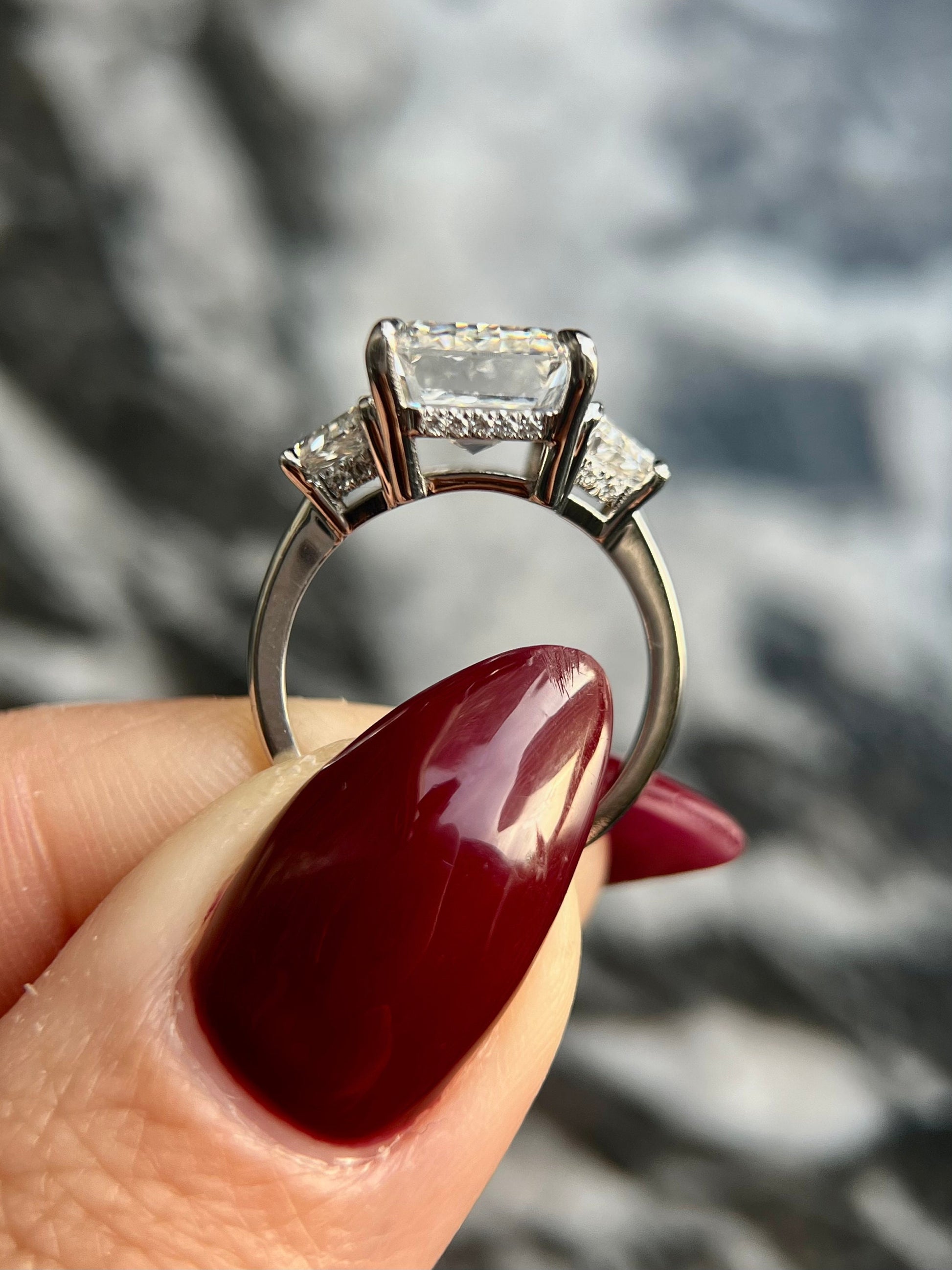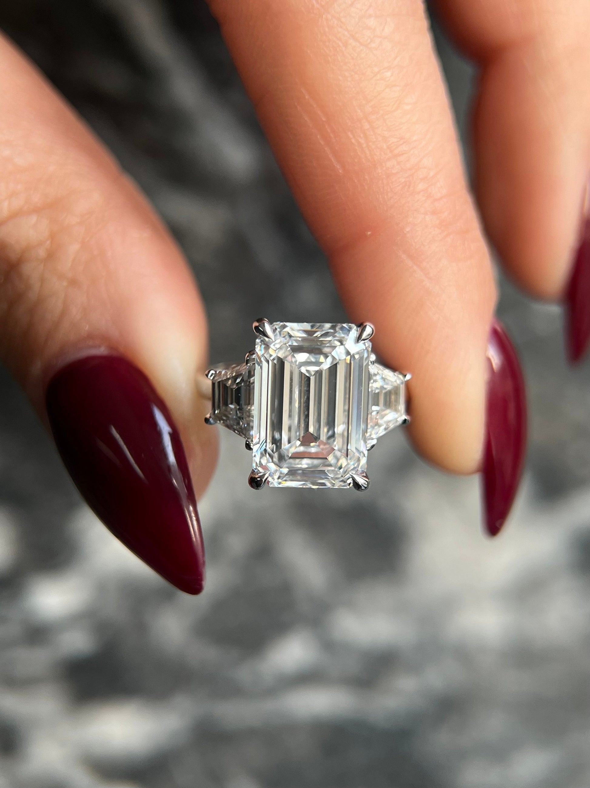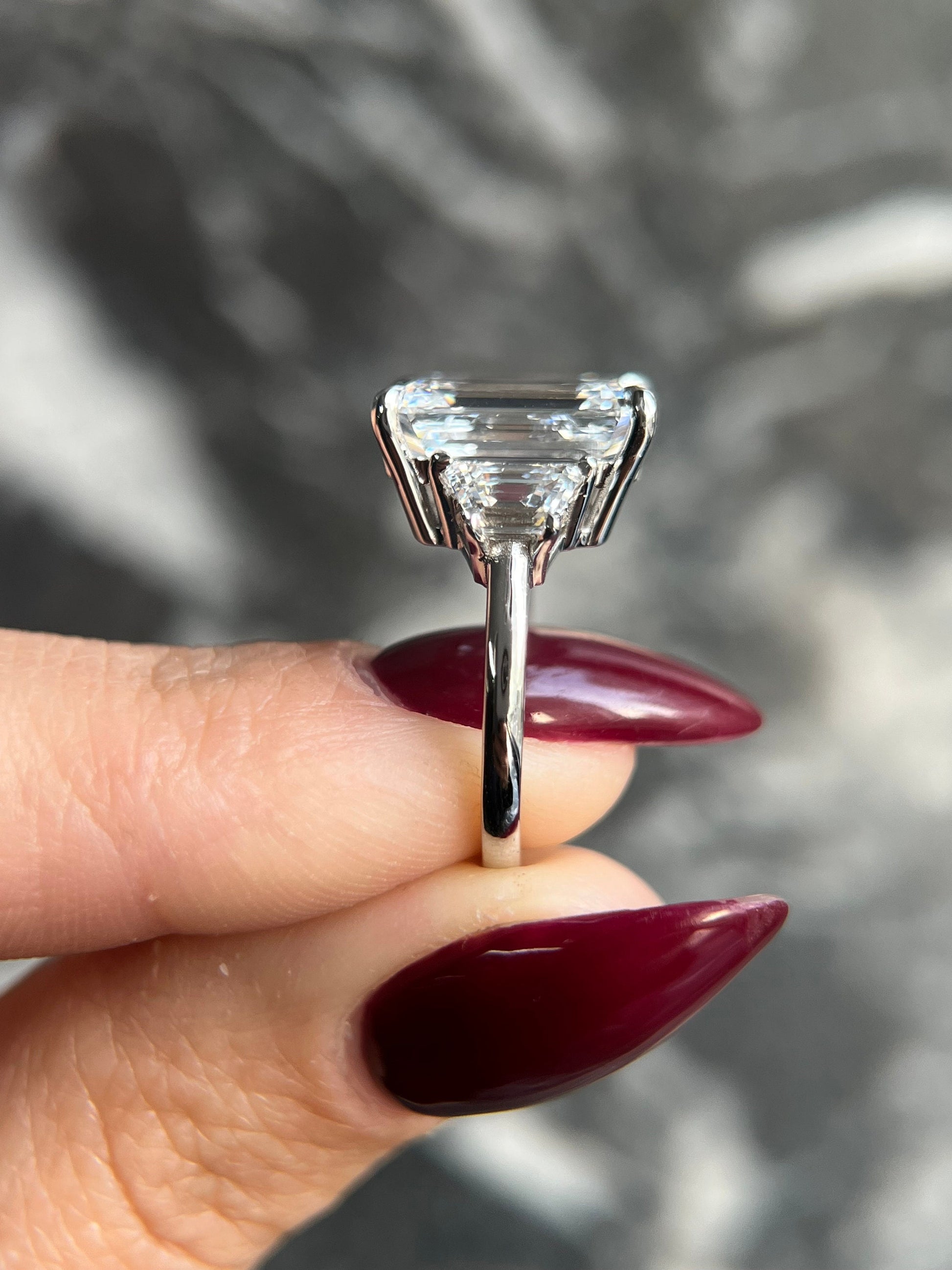 Emerald Cut 8 carat F Color VVS2 IGI Certified Lab Grown Diamond Three Stone Engagement Ring Side Trapezoids Round Cut Hidden Halo Gold