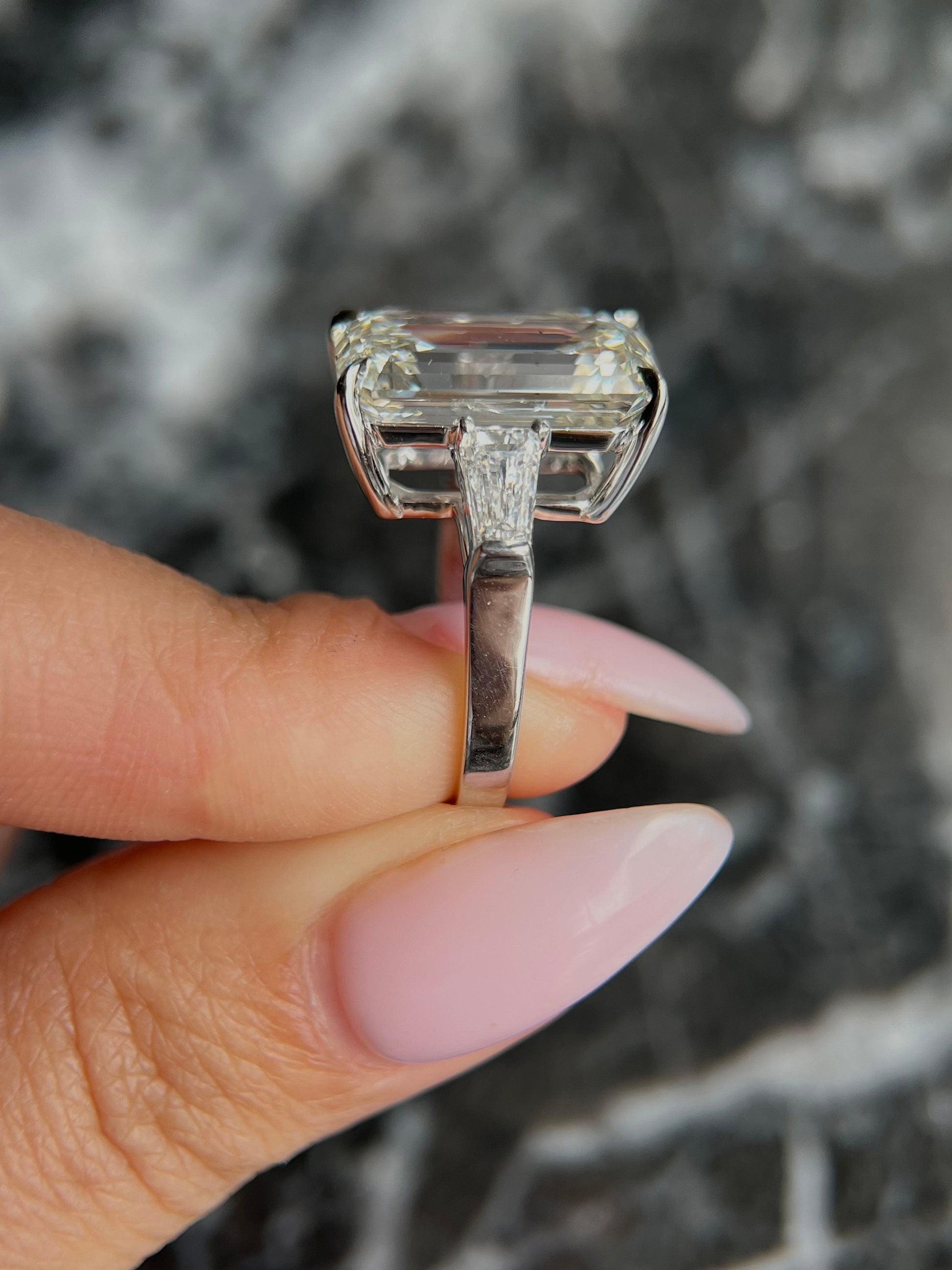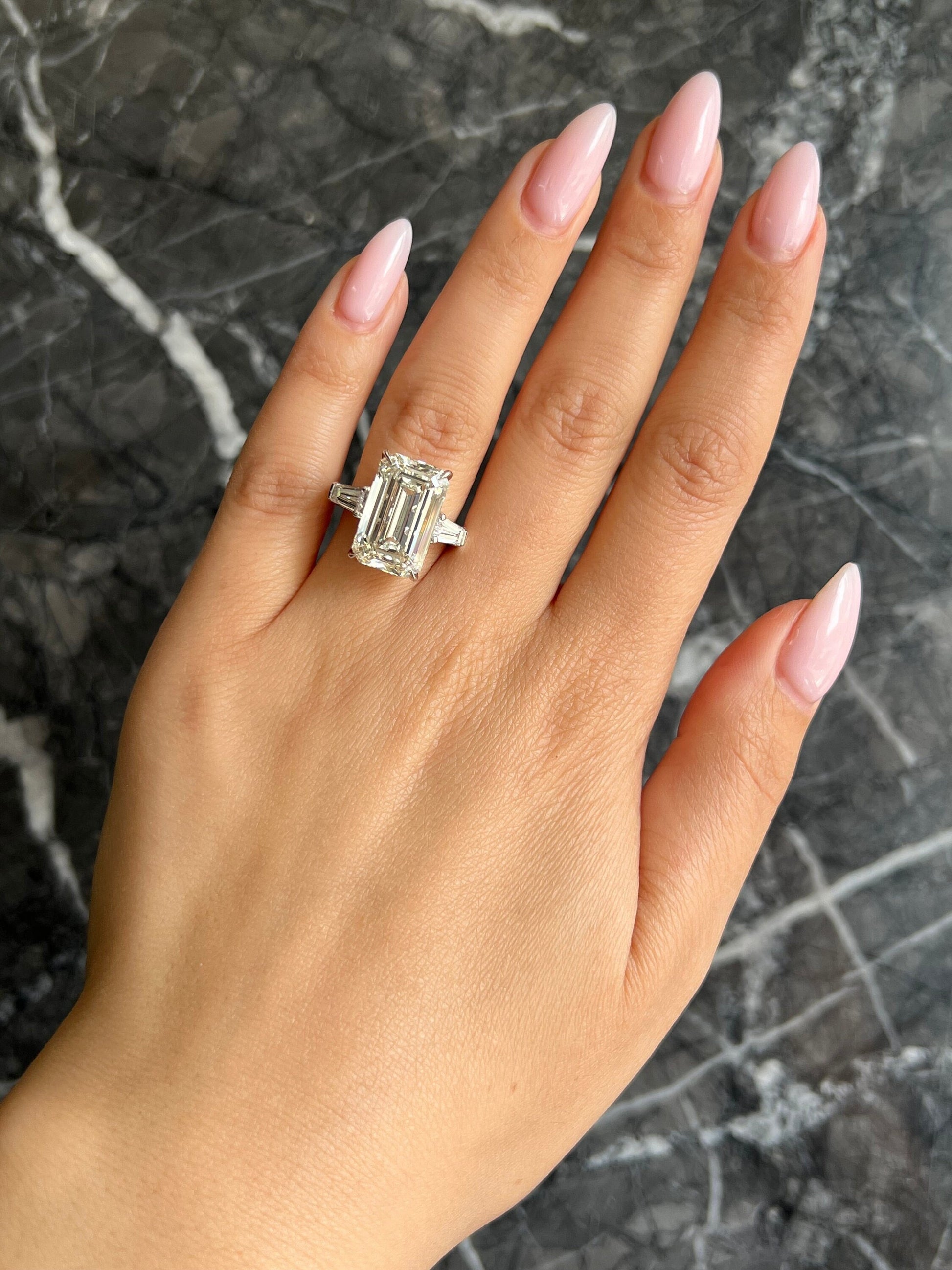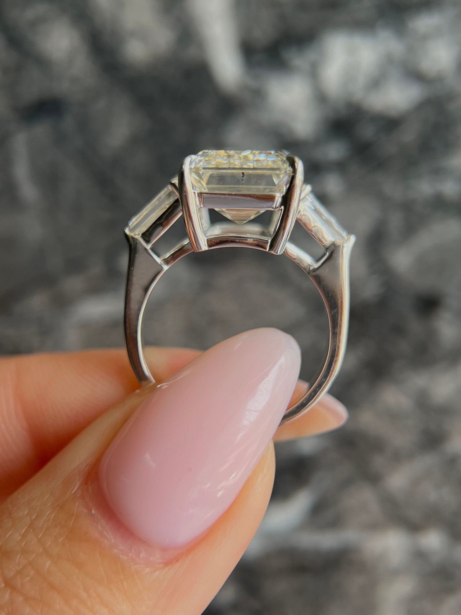 This handcrafted three stone lab grown engagement ring features a magnificent IGI Certified emerald cut diamond center stone perfectly complemented by two stunning baguette diamonds on either side. If you're considering this special ring it's important to note that once you place this ring on your finger- you'll never want to take it off!