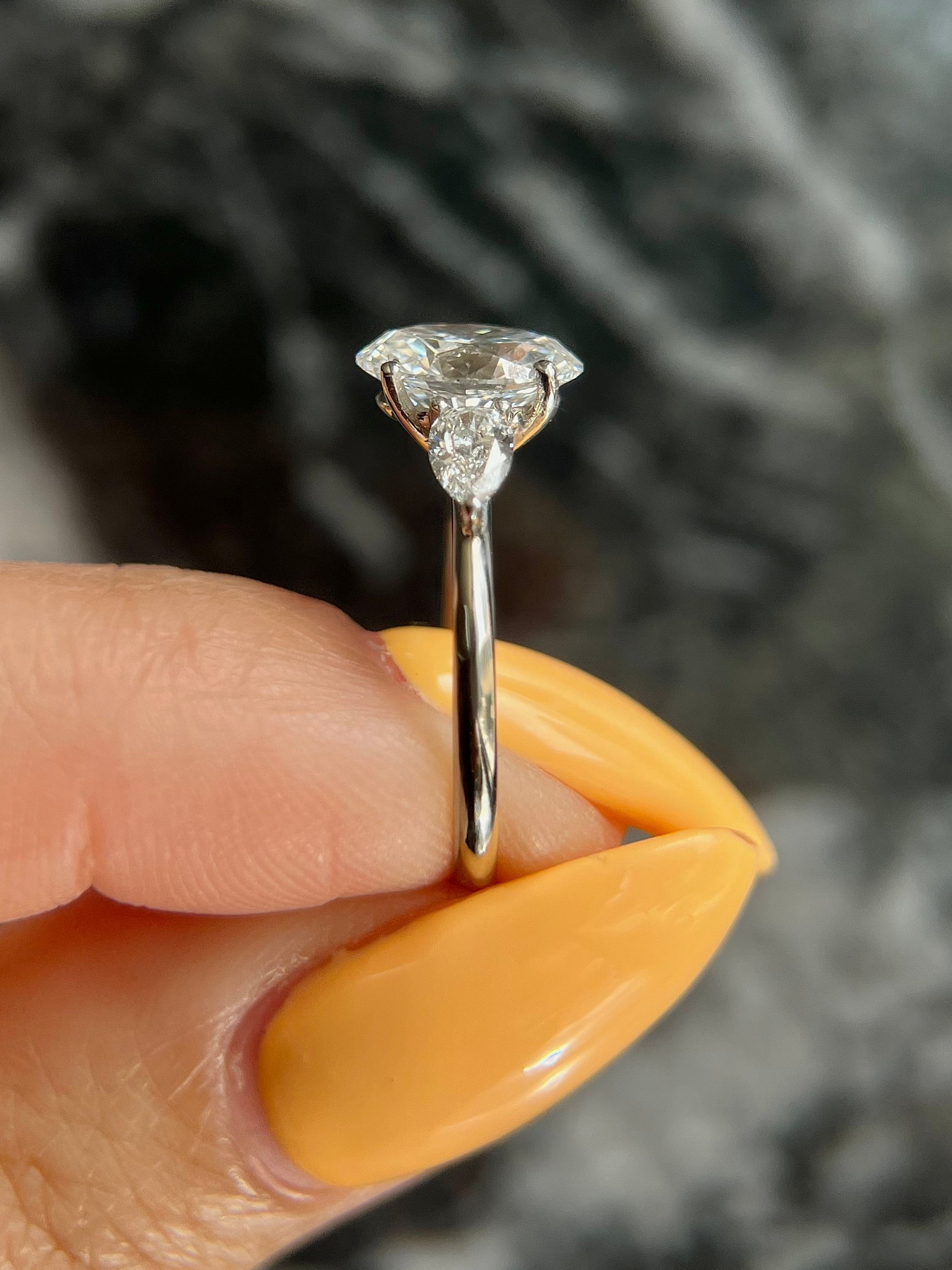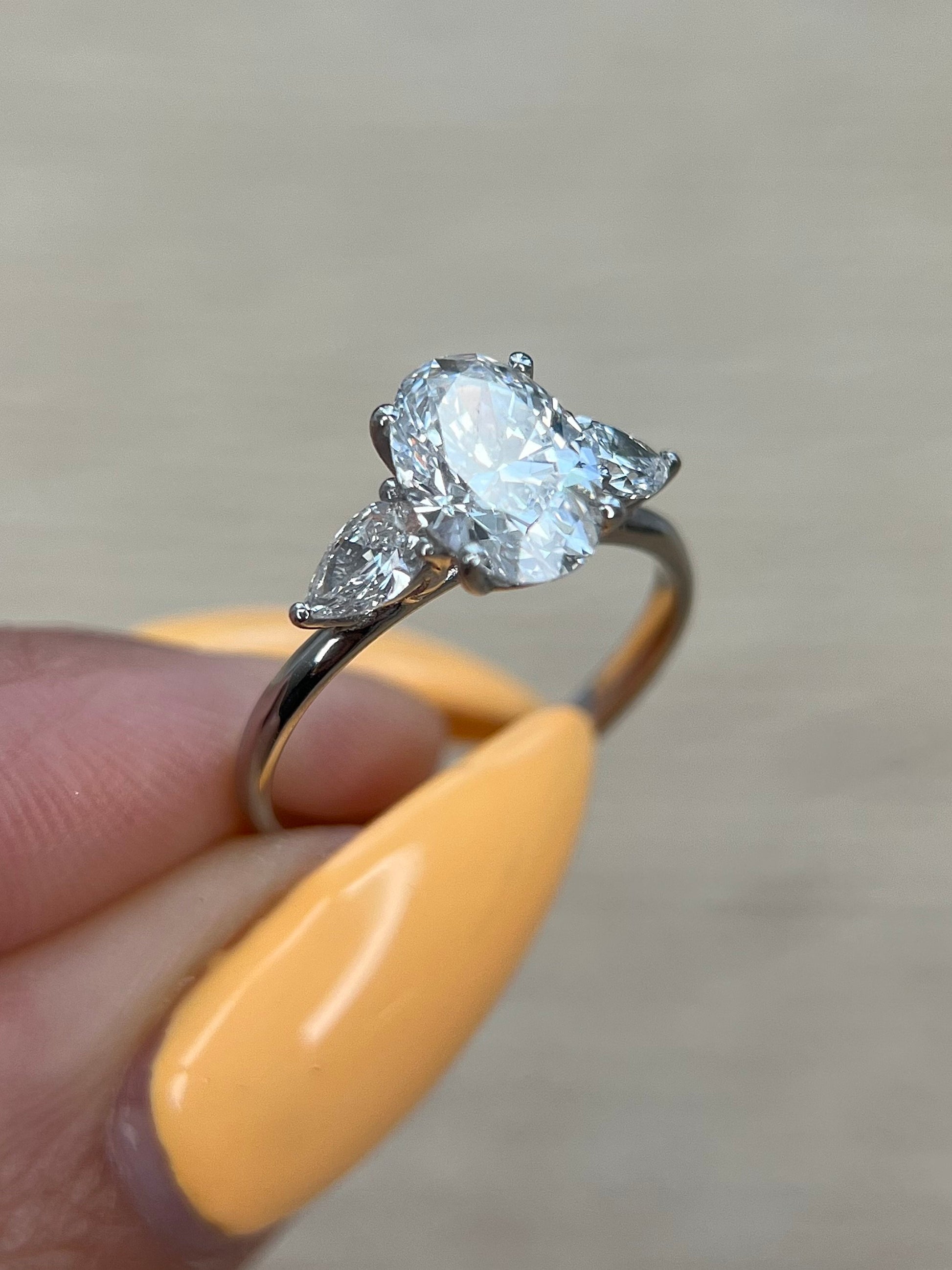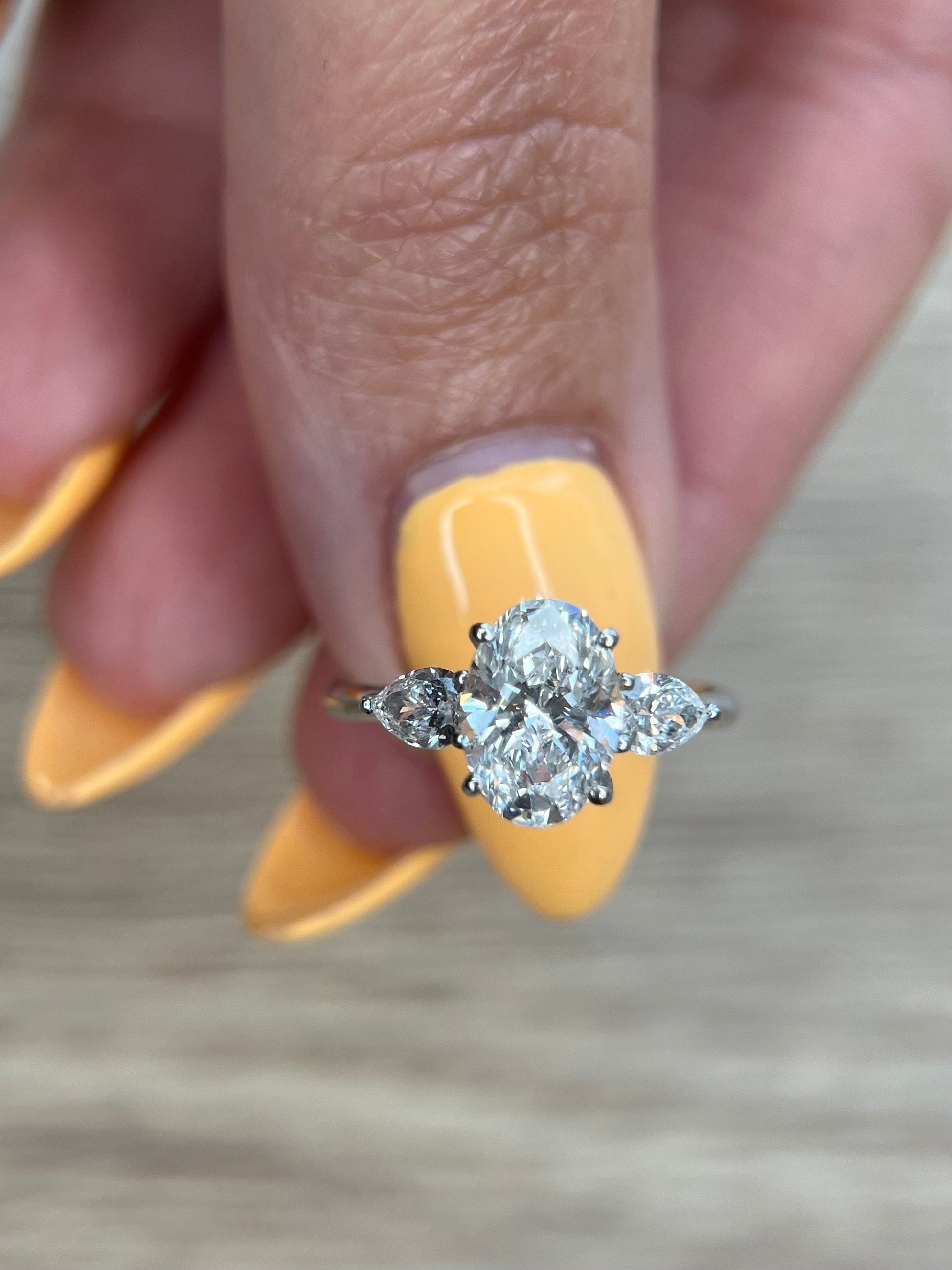 Oval 2.5 carat IGI Certified F Color VS1 Clarity Lab Grown Diamond Three Stone Engagement Ring, Side Pear Diamonds