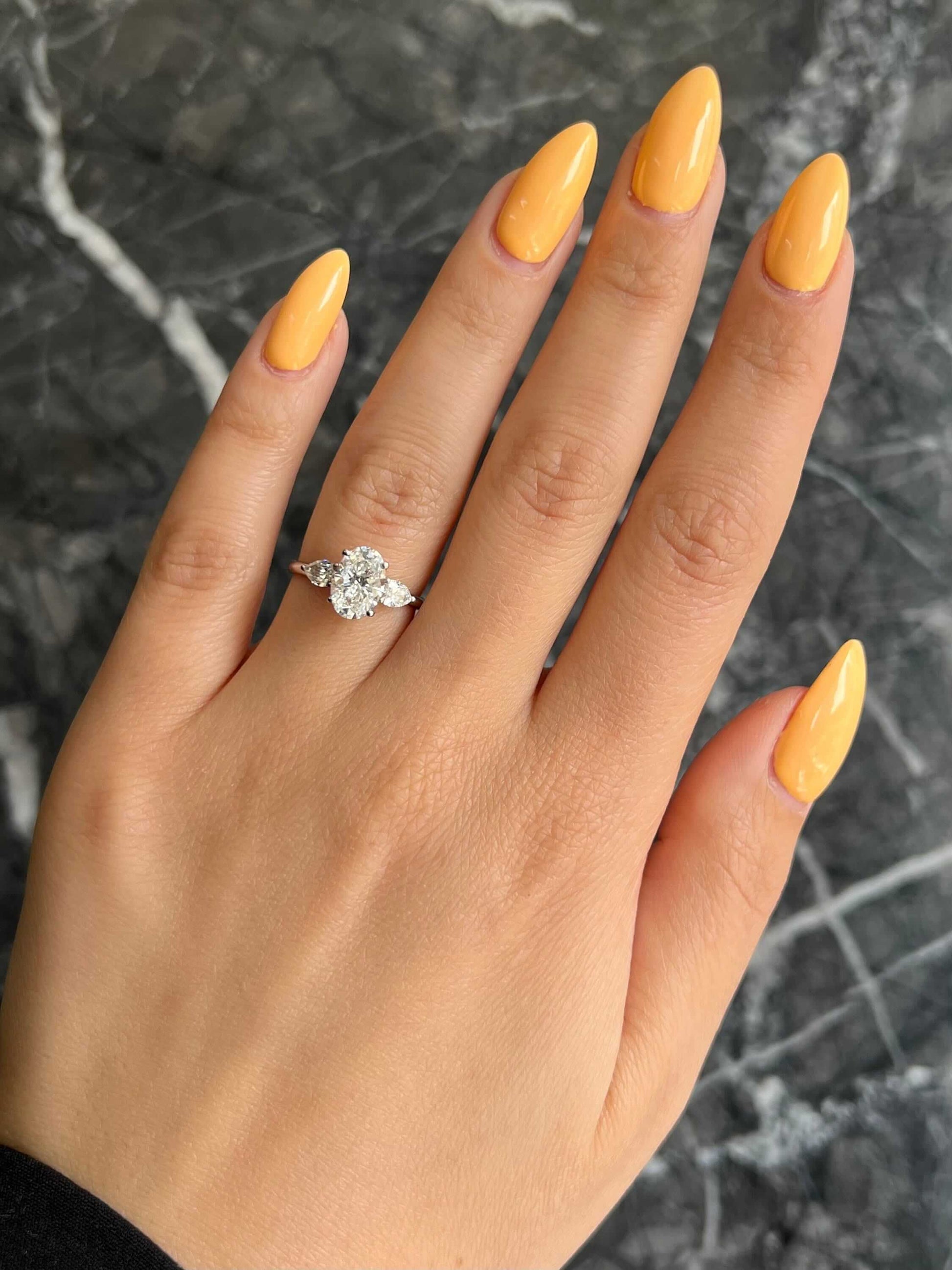 This breathtaking ring is expertly handcrafted by our skilled jewelers with the utmost attention to detail ensuring that it is of the highest quality using only the finest materials. Featuring a captivating 2 carat Oval cut lab grown diamond center stone nestled between two sparkling pear cut diamonds of 1/2 carat, this engagement ring provides the perfect backdrop for the dazzling diamonds in this rare and exquisite three stone engagement ring!