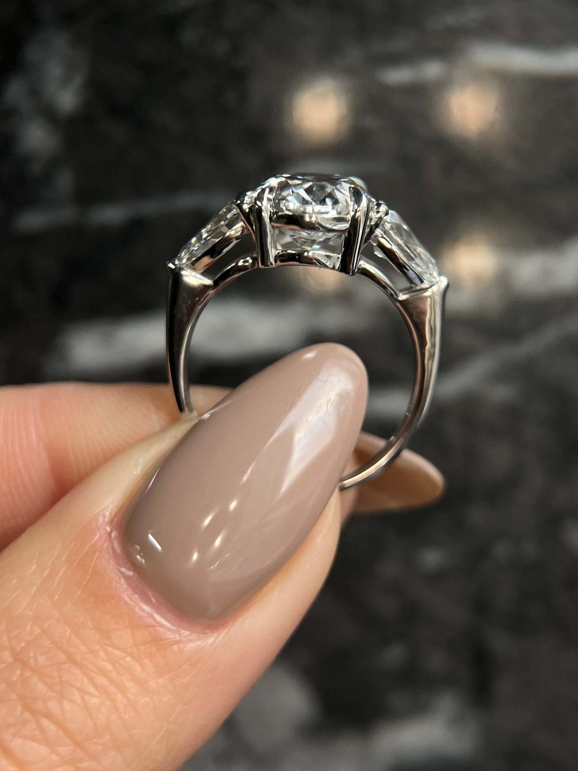 This breathtaking ring is expertly handcrafted by our skilled jewelers with the utmost attention to detail ensuring that it is of the highest quality using only the finest materials. Featuring a captivating 4 carat Oval cut lab grown diamond center stone nestled between two sparkling pear cut diamonds of 1 carat, this engagement ring provides the perfect backdrop for the dazzling diamonds in this rare and exquisite three stone engagement ring!