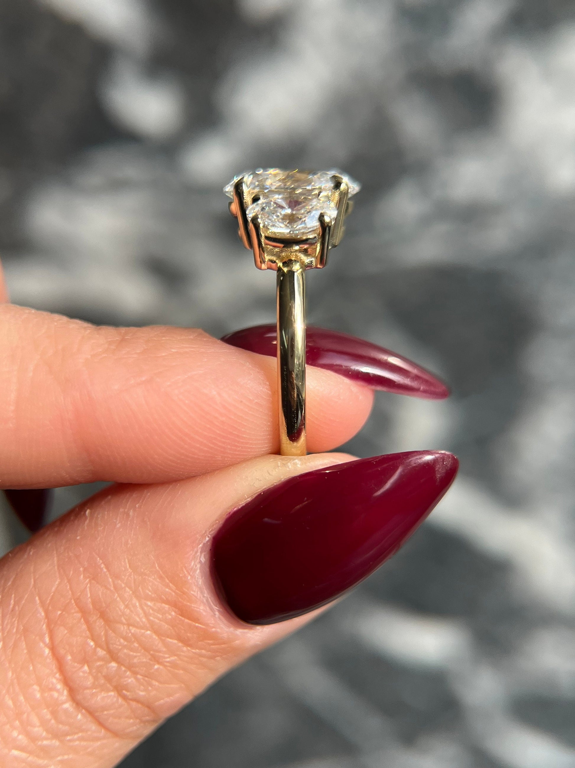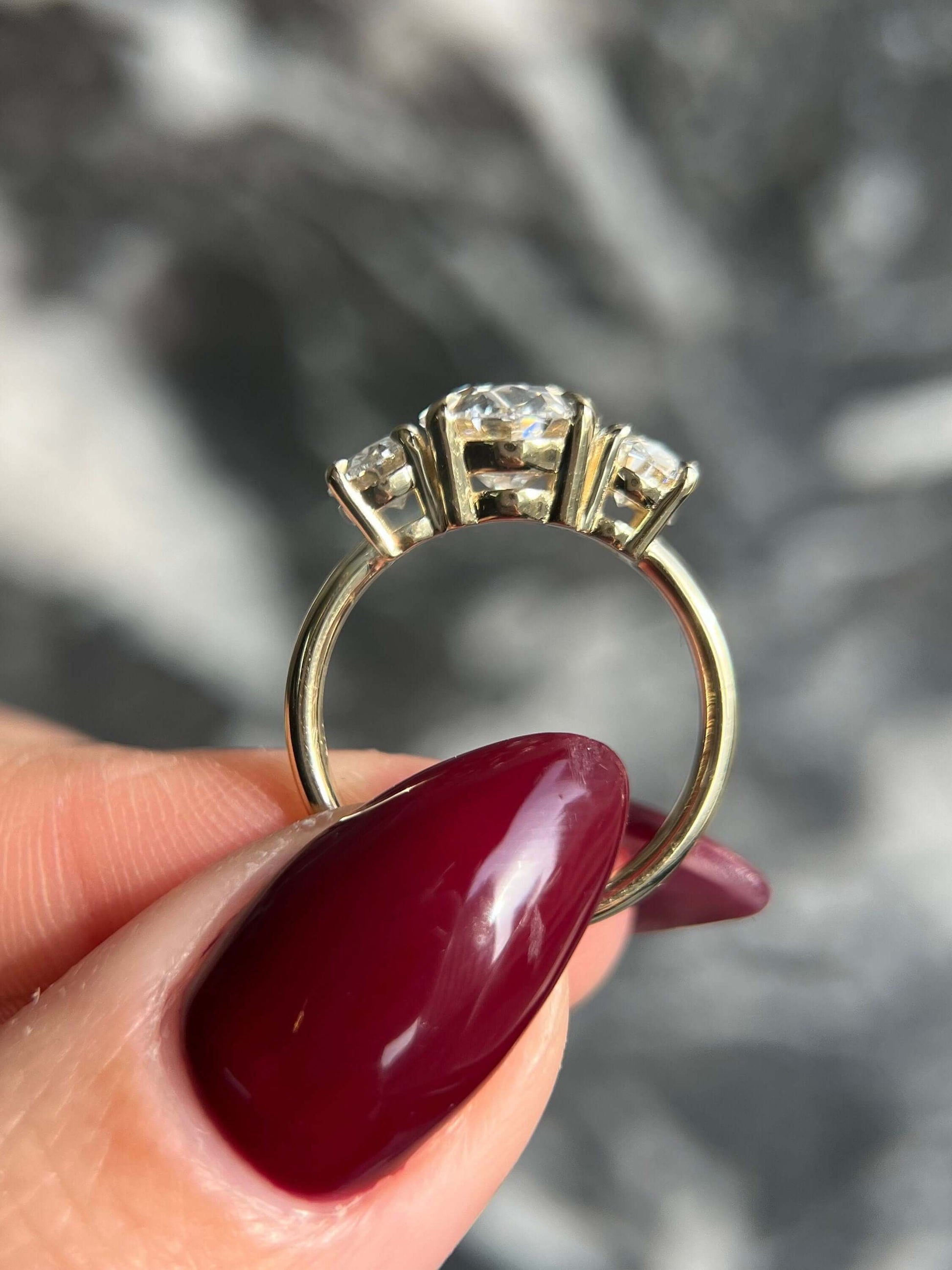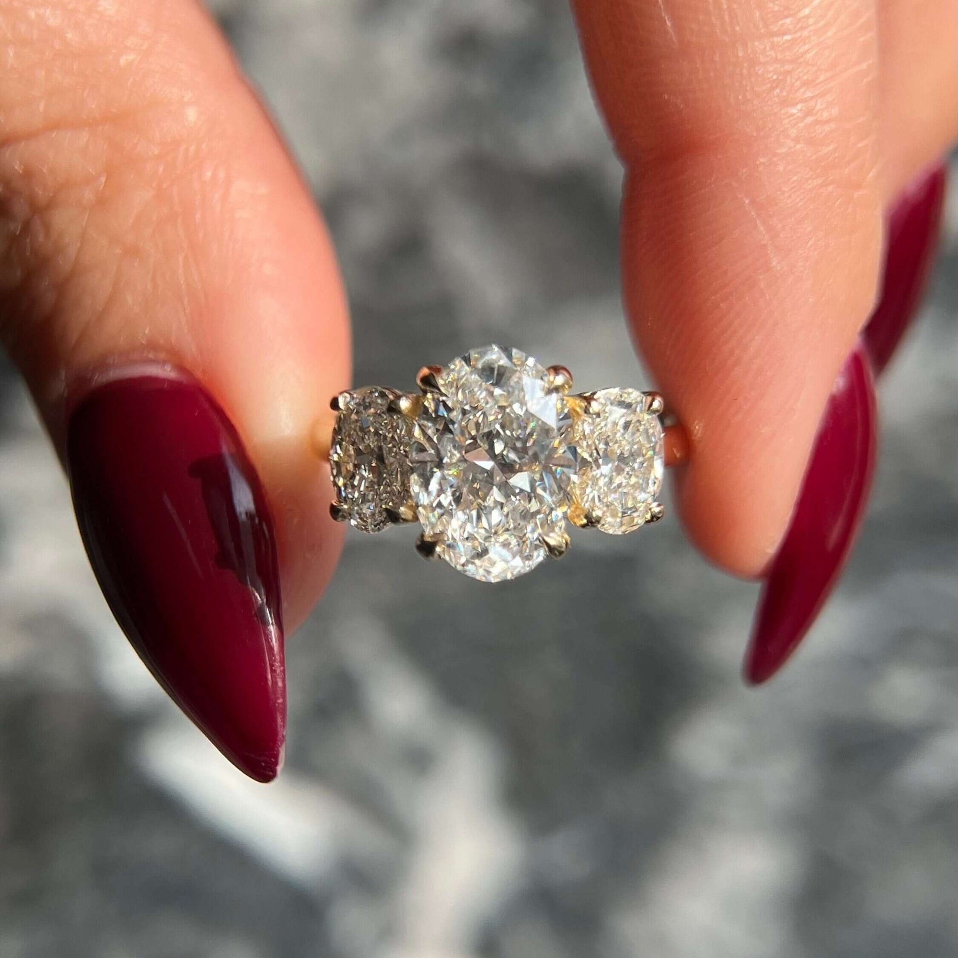 This breathtaking ring is expertly handcrafted by our skilled jewelers with the utmost attention to detail ensuring that it is of the highest quality using only the finest materials. Featuring a captivating 3 carat Oval cut lab grown diamond center stone nestled between two sparkling oval cut diamonds of 1 carat each, this engagement ring provides the perfect backdrop for the dazzling diamonds in this rare and exquisite three stone engagement ring!