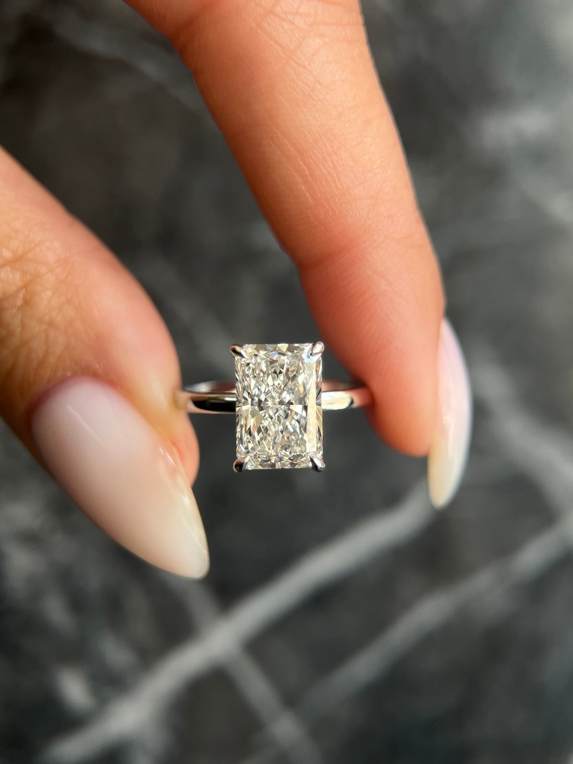 Radiant 3.1 carat IGI Certified F Color VS1 Clarity Lab Grown Diamond Solitaire Engagement Ring with Hidden Halo, Handmade of Solid Gold