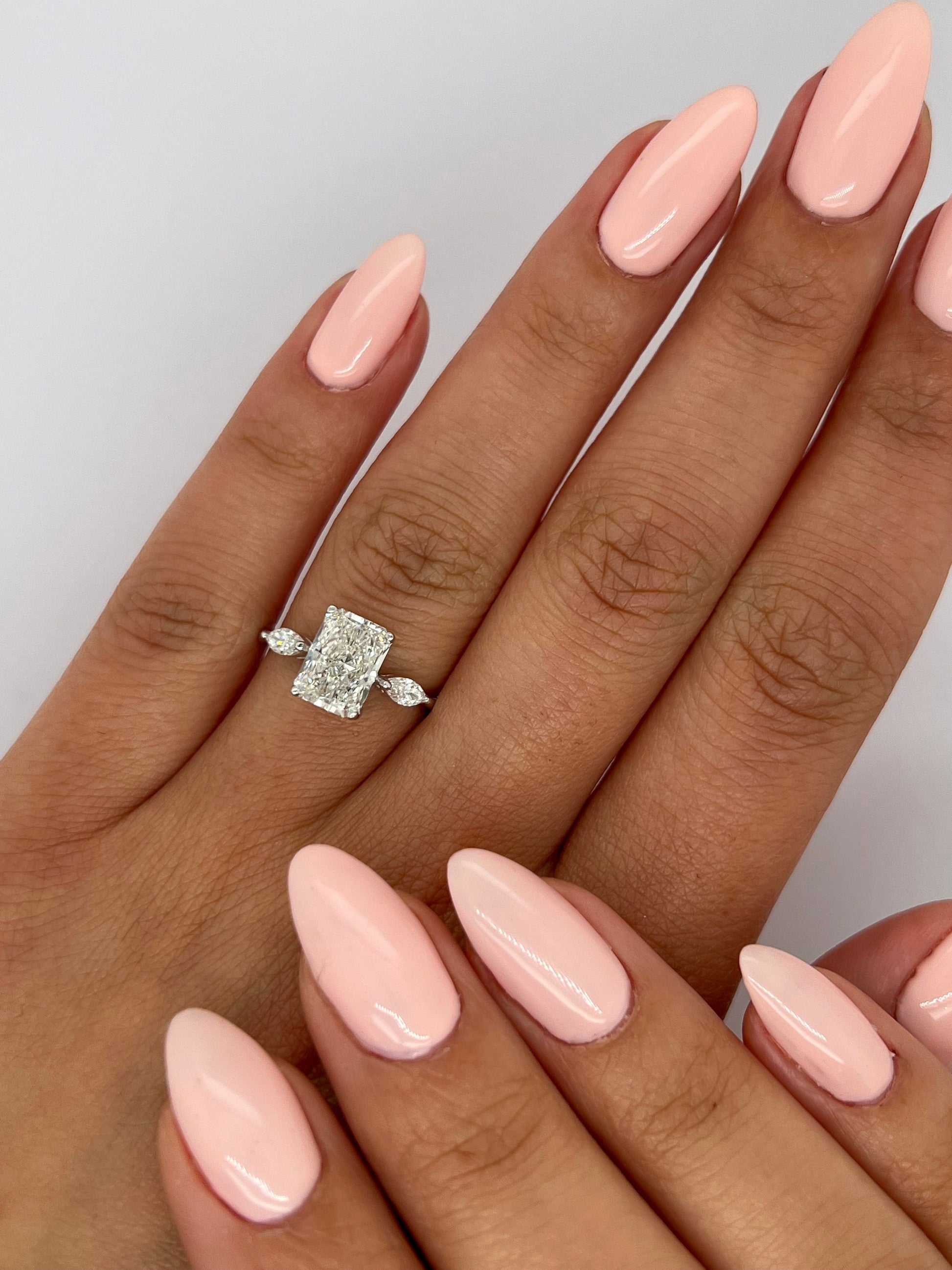 This jaw-dropping ring is made with an exquisite 2 carat radiant cut diamond center stone diamond certified by IGI with F color and VVS2 clarity ensuring that this colorless diamond sparkles with a brilliance that is truly mesmerizing! If you're looking for a one-of-a-kind handcrafted ring of the highest quality, this 3 stone lab grown diamond solitaire engagement ring is the perfect choice and is sure to take your loved one's breath away!