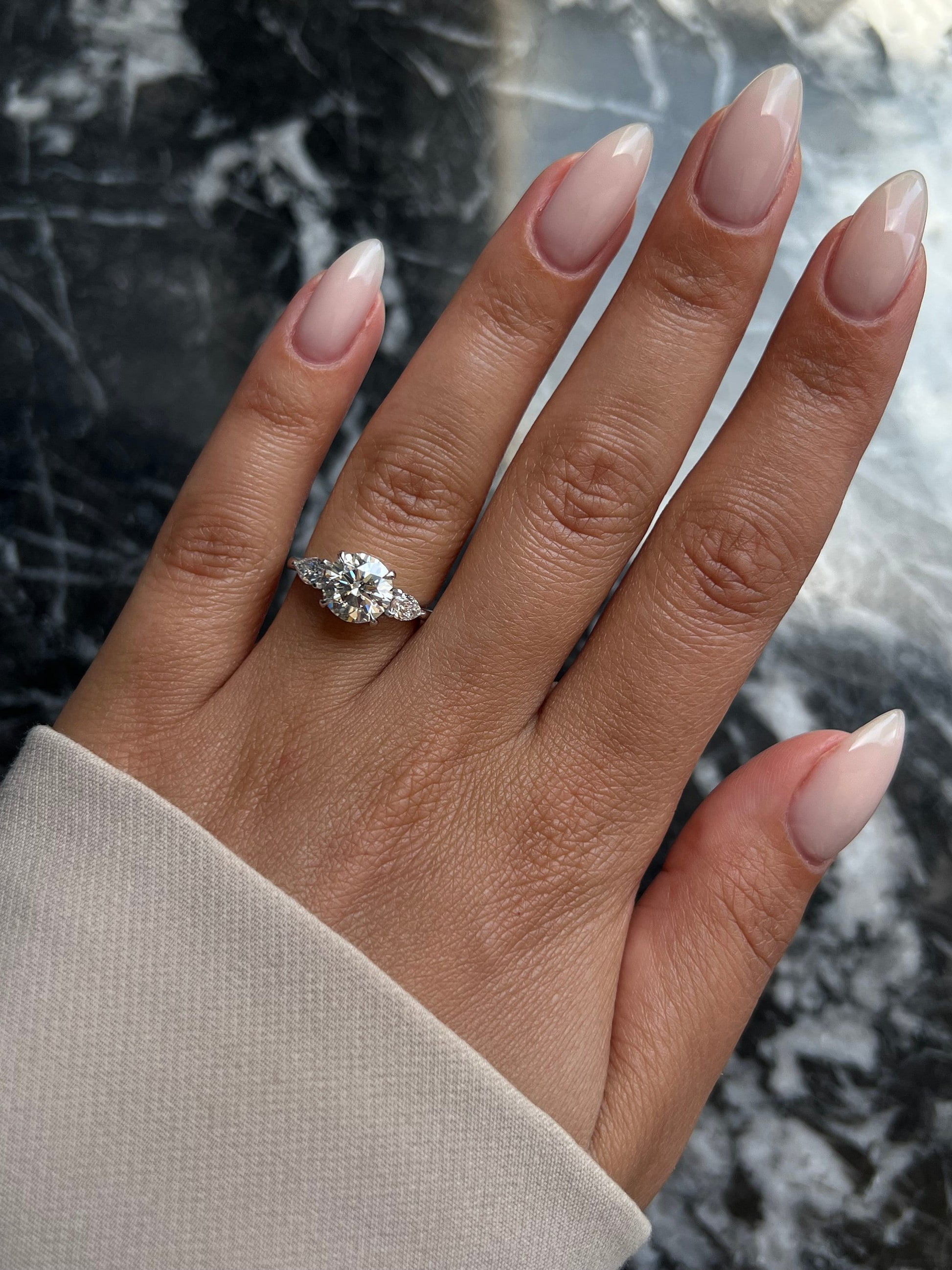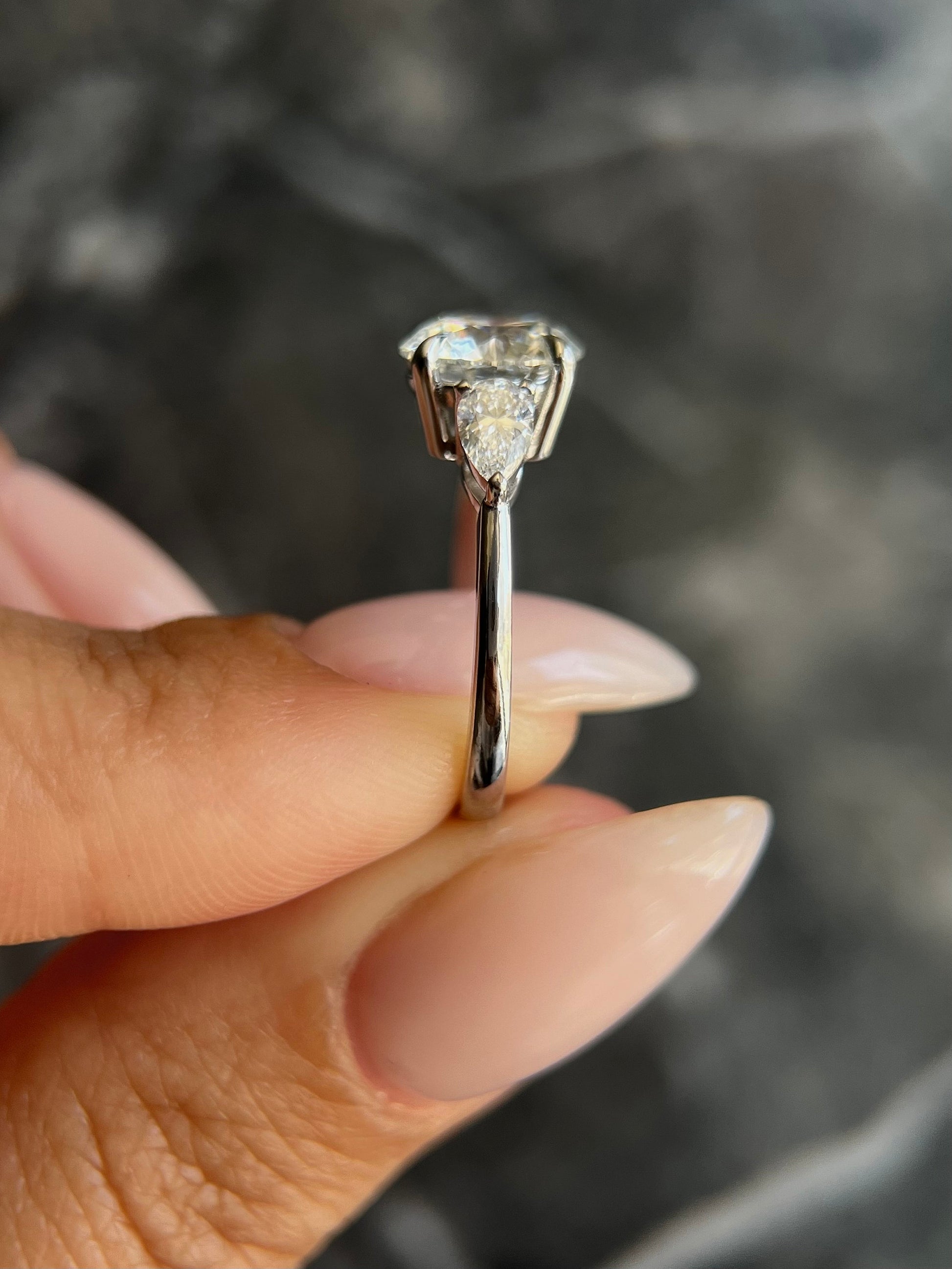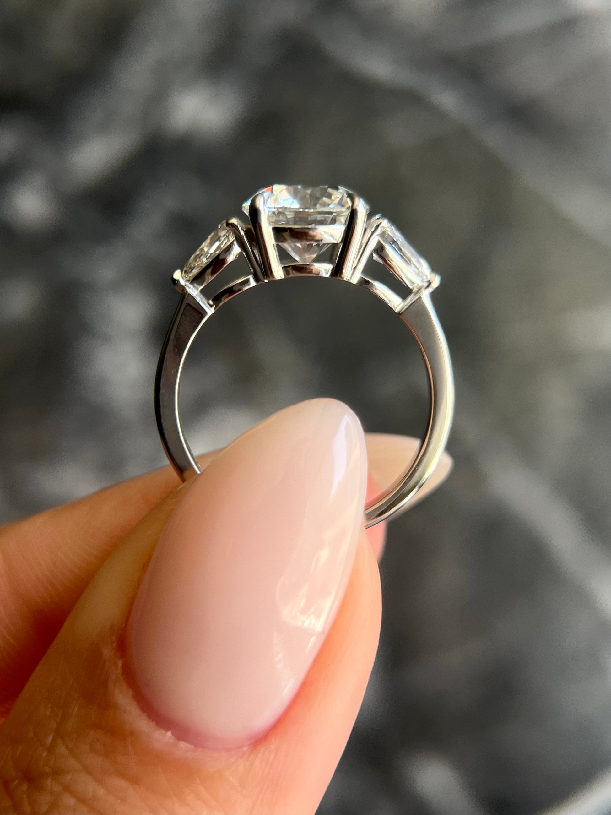 Round Cut 2.4 carat IGI Certified Lab Grown Diamond E Color VS1 Clarity Three Stone Engagement Ring, Side Pear Cut Diamonds